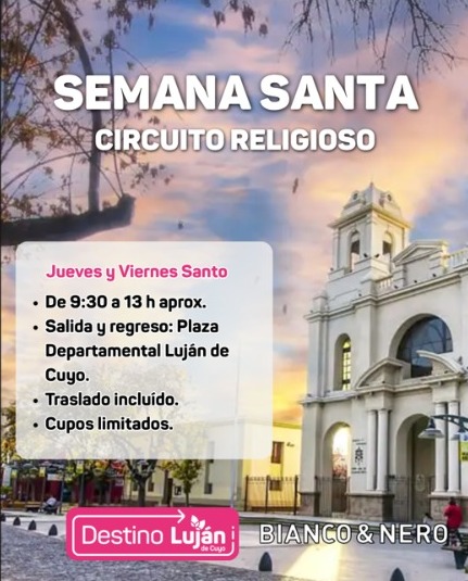 Semana Santa en Luján de Cuyo, salimos desde la Plaza departamental los días 2 y 3 de abril a partir de las 9:30 horas, 10 minutos de tolerancia. Incluye traslado.